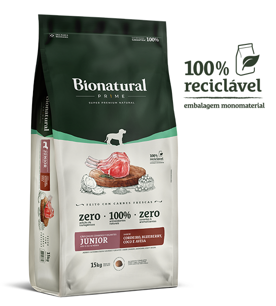Carne fresca (mín. 3% - carne mecanicamente separada de aves e fígado de suíno), farinha de carne e ossos de ovino, farinha de vísceras de aves, farinha de torresmo, ovo em pó, sorgo integral moído, quirera de arroz, aveia (mín. 3,95%), ômega 3 [óleo de peixes e biomassa de microalgas (Schizochytrium sp.)], óleo de aves, fibra de maçã, banana, mirtilo